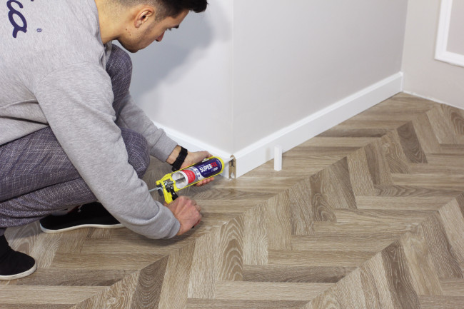 Мы советуем использовать клей Decostore SUPERFIX. Достаточно нанести его на монтажную поверхность плинтуса и плотно прижать плинтус к стене, фиксируем на 4-5 секунд и всё готово! Кроме того, нельзя забывать про стыки — наносим на них клей, чтобы они со временем не разошлись. При фиксации плинтуса придвиньте его к месту стыка соседнего изделия, чтобы на этом на стыке выступил клей. В конце удаляем излишки клея, важно успеть до момента его затвердения. Перед началом работ обязательно воспользуйтесь инструкцией по применению клея на упаковке.